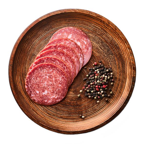 - Det frosne spæk kommes i lynhakkeren, køres ned til ca. 4-5 mm størrelse, herefter tilsættes det skalfrosne okse, grisekød samt krydderier, starterkultur og der køres til den ønskede grovhed er opnået.